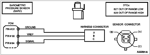 The BARO (barometric pressure) sensor is a variable capacitance sensor that when supplied with a 5-volt reference signal from the PCM produces a linear analog voltage signal that indicates pressure.