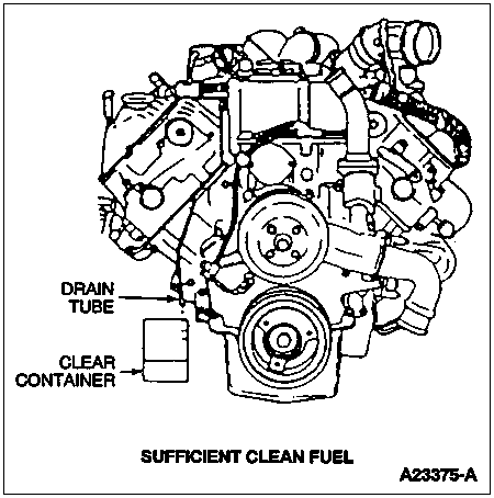 Route a hose from the fuel drain line to a clear container and open the drain. Crank the engine and observe the fuel flowing into the container. Stop cranking the engine when the container is half full.