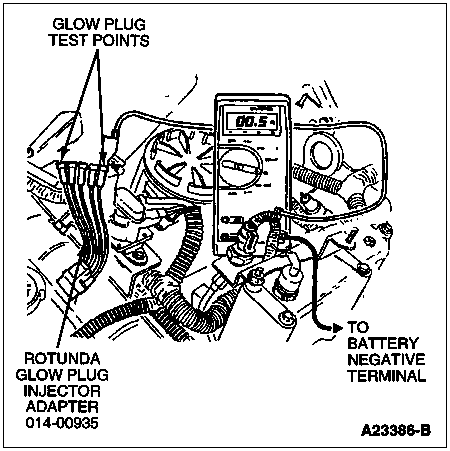 Disconnect all of the glow plug/injector harness connectors from the valve cover gaskets. With the Rotunda Glow Plug Injector Adapter 014-00935 or equivalent installed, measure glow plug resistance to ground (preferably B-). A resistance measurement of 0.1 to 2 ohms indicates a good glow plug.