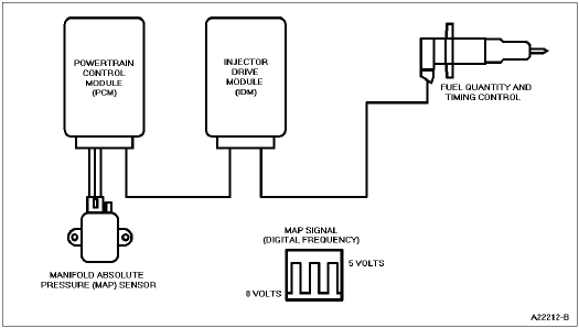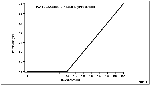 The manifold absolute pressure (MAP) sensor is a variable capacitance sensor which, when supplied with a 5-volt reference signal from the powertrain control module (PCM), produces a digital frequency signal that indicates pressure.