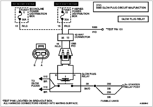 | Glow Plug Feed to Ground | B+ | Voltage should be present 10 to 120 seconds after key cycled on, dependent upon battery voltage, barometric pressure (altitude), and engine oil temperature. |
