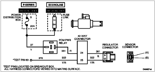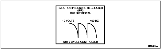 Battery voltage is supplied to the IPR when the ignition key is in the ON position. Valve position is controlled by switching the output signal circuit to ground inside the PCM. ON/OFF time is modulated from 0 to 50% dependent upon the desired injection control pressure.