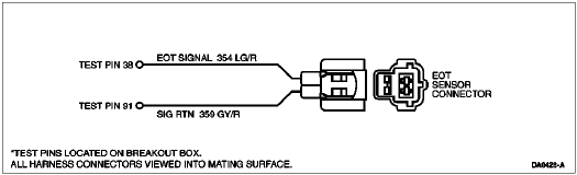 An EOT sensor signal that is detected out of range (high or low) by the PCM will cause the PCM to ignore the EOT sensor signal and assume an engine oil temperature of -34°C (-29°F) for starting and a temperature of 100°C (212°F) for engine-running conditions. The CHECK ENGINE light will also be illuminated as long as the condition exists.