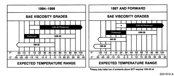 Check service records for correct oil type and viscosity for the vehicle operating temperature. Single grade or 15W 40 oil is not recommended for cold ambient temperatures. Oil that has had extended drain intervals will have increased viscosity (become thicker) and will make engine cranking more difficult and starting less reliable at temperatures below freezing. Refer to the lube oil chart below to select the correct (viscosity) oil to use for the temperature condition(s) the engine will be operating in. Use CG-4/SH rated oil.