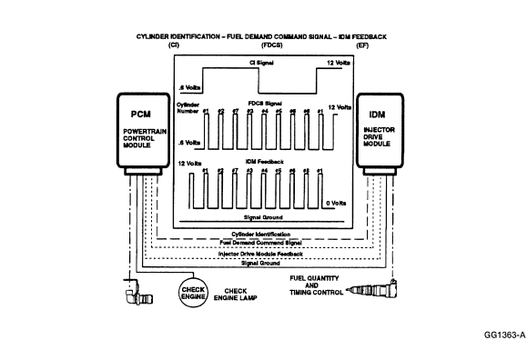 Fuel Demand Command signal is a 0 to 12 volt wave form signal that communicates from the PCM to the IDM the required engine timing and duration of injector firing. The timing and duration of the signal is determined by the PCM calibration and the signals of various sensor inputs. The FDCS signal is generated by the PCM by "pulling down" (switching to ground) a volt communication circuit in the IDM.