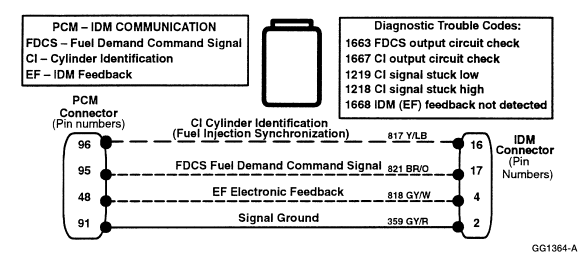 Cylinder Identification (CI) signal is a 0 to 12 volt wave form signal that communicates from the PCM to the IDM the position of cylinders 1 & 4. This signal is used by IDM to synchronize the injector firing sequence. This signal is calculated from the signal generated from the Camshaft Position Sensor (CMP). The CI signal is generated by the PCM by "pulling down" (switching to grd.) a 12 volt communication circuit in the IDM.