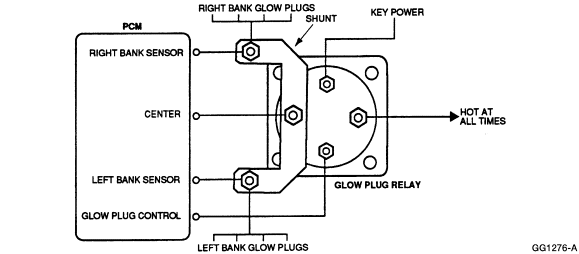 The GPM system uses two low resistance shunts. One shunt conducts the current to the glow plugs in the left cylinder head and the other shunt conducts the current for the right cylinder head. Three sensing wires measure the voltage drops across the shunts when the glow plugs are operating (the voltage drops are proportional to the current in the shunt). The voltage drops are measured after the glow plug current stabilizes (approximately 30 seconds). Therefore, this system only checks for glow plug operation when oil temperature and/or altitude conditions cause the glow plugs to stay on for 30 seconds or more and system voltage is between 11.8 and 14.0 volts.